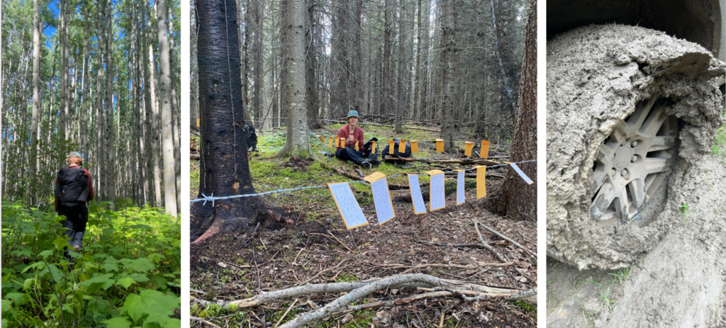 Planning work days in Kakwa, however, required a certain flexibility. When the rain hit, the roads transformed into a muddy slip ’n slide – but nothing the crews couldn’t handle. After all, what’s a field season without a few dramatic access obstacles? Each day, we set out to check trail camera images, collect hair samples from the barbs, and dismantle each site. Many of the 40 sites had earned their own stories or nicknames, and we shared our favourites as we took them down, giving each a proper and sentimental goodbye.