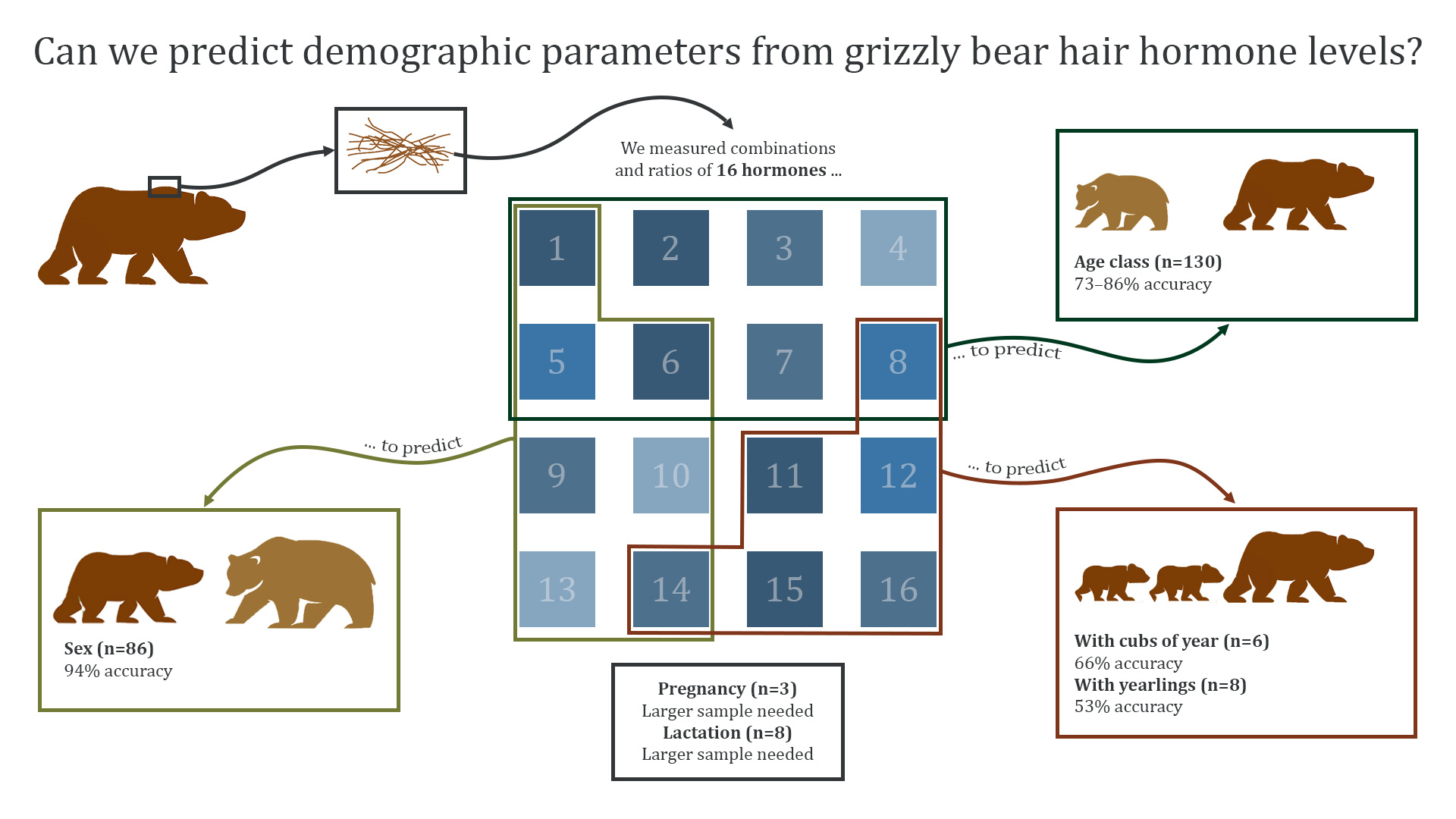Although it took many years of hard effort to capture 130 grizzly bears, sample size was still an issue when the team tried to predict female reproductive status – just 3 of the bears were pregnant at the time of capture, 8 were lactating, and 6 had young cubs. These low sample sizes meant that we could not predict pregnancy or lactation, and could only correctly predict if a female had a cub under 1-year old two out of three times. More samples from bears whose status we know would help us improve our accuracy on every prediction, although some things, like differences between males and females, will always have a stronger effect on hormone levels than a temporary status like whether a female has cubs.