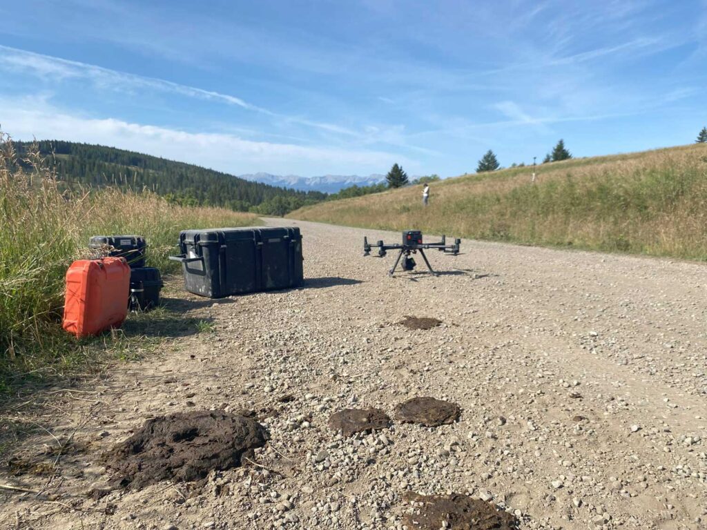 Left: Nick setting up the drone at Sharples Creek. Right: Drone next to evidence of cows in the Sharples Creek watershed. Photos: Ben Kissinger.