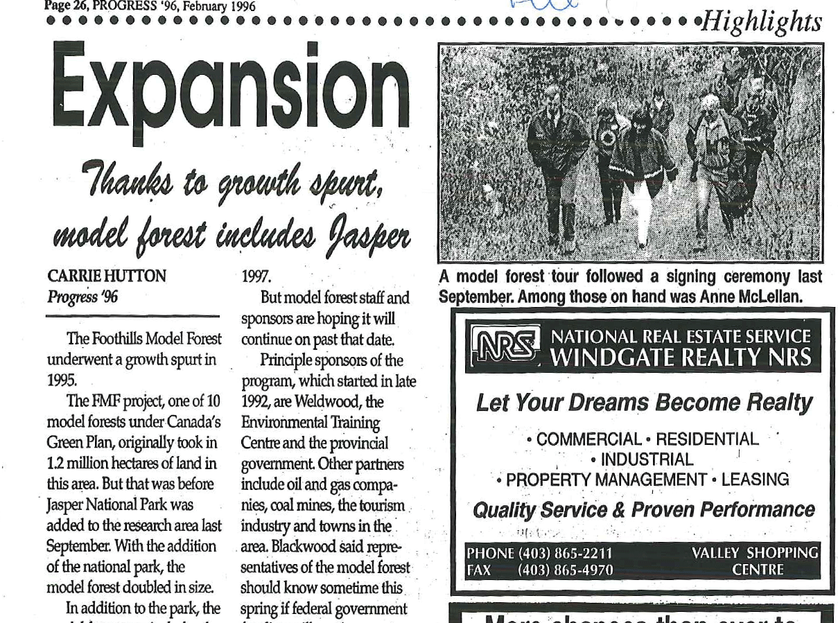 Article in February 26, 1996 Parklander insert on expansion of the FMF to include Jasper National Park, funding sources, twinning with Mexican forest.