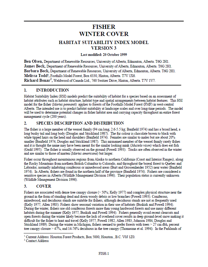 Habitat Suitability Index model for fisher winter cover habitat based on habitat attributes such as structure, type and spatial arrangements.