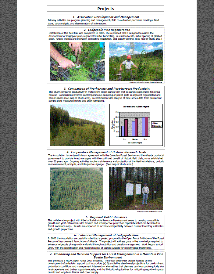 Foothills Growth and Yield Association – Project Overview Poster, including photos and chart, summarizing each of seven Growth and Yield Association projects. Gallery Downloads FGYA_2008_06_Poster_FGYA_ProjectsOverview_thumb.gif FGYA_2008_06_Poster_FGYA_ProjectsOverview.pdf Author Foothills Research Institute Published Jun 01, 2008 Subject Area Lodgepole Pine Plants Record Type Summaries and Communications Posters Related Programs Forest Growth Organization of Western Canada (FGrOW)