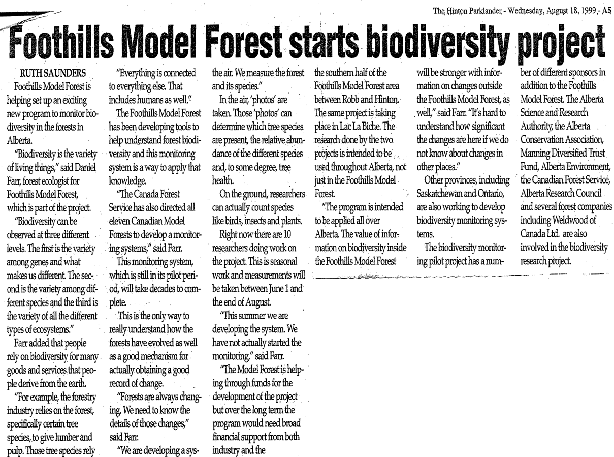 Foothills Model Forest starts biodiversity project Article in August 18, 1999 Hinton Parklander on the development of a new biodiversity project. Gallery Downloads ABMP_1999_08_MediaArt_FMFStartsBiodiversityProject.gif ABMP_1999_08_MediaArt_FMFStartsBiodiversityProject.pdf Author Saunders, Ruth Published Aug 01, 1999 Record Type Summaries and Communications Media Articles