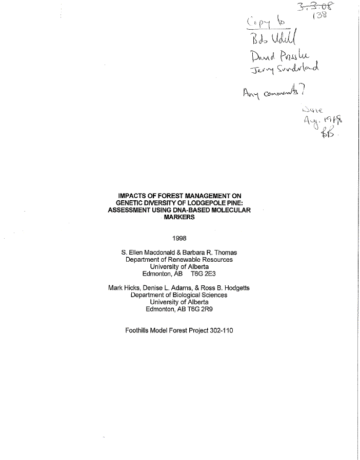 Report on effects of different methods of forest regeneration on genetic diversity in lodgepole pine; measured using DNA-based molecular markers.